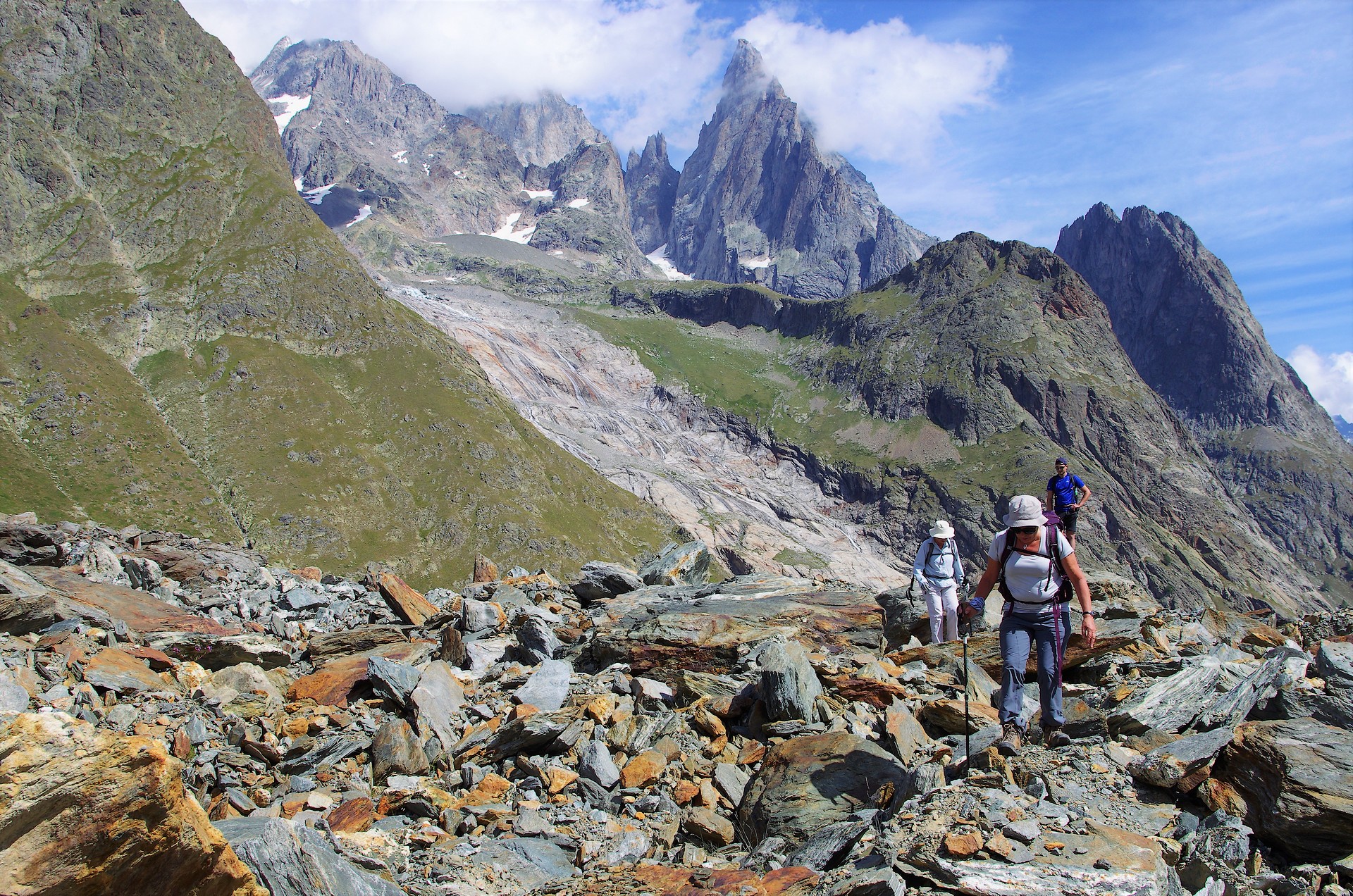 Direction l’Italie pour cette troisième journée. Le tunnel du Mont-Blanc a cette capacité déconcertante de faire passer du côté face au côté pile du massif en quelques minutes. Le changement de décor est immédiat. Le minéral s’impose face à la neige et à la glace. Partout les géants glacés ont reculé en altitude plus encore que sur le versant français, laissant derrière eux des remparts rocheux nus et sillonnés de cascades. On a un peu l’impression d’être passé derrière les coulisses d’un décor de cinéma. Les Jorasses, en Italie, ont perdu de leur raideur. Quant à la voie normale du souverain des Alpes, elle se fait ici essentiellement en rocher. Le Val Ferret et le Val Veny, qui courent au pied de la chaîne, sont les deux portails qui permettent au randonneur d’approcher les sommets voire, pour les plus aventureux et expérimentés, de les gravir. Pour notre petit groupe, l’introduction à ce nouveau paysage se fera par le second,, immense vallon fermé tout à l’ouest par le col de la Seigne et que sillonnent quelques glaciers encore colossaux, malgré un recul marqué. C’est le cas de celui de la Brenva, qui surmonte l’accès au tunnel du Mont-Blanc. C’est surtout le cas de celui de Miage, le plus grand de ce côté du massif, formidable corridor de glace descendu depuis les Dômes de Miage et dont la virgule finale, en forme de pince, a créé une énorme moraine à partir de laquelle le randonneur peut partir explorer cet univers singulier.