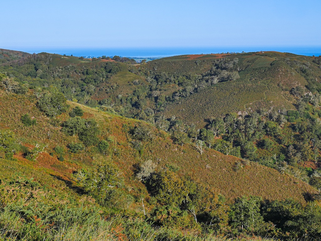 Une longue trace grise et gravillonnée remonte la pente au sud-est pour viser un col perché à 421m entre le sommet du Manddale et celui du Faalegi. J’y trouve mes premiers pottoks, ces petits poneys sauvages emblématiques du Pays Basque. Un coup d’oeil en arrière m’aide à mesurer le chemin déjà parcouru et la distance rapidement mise avec l’océan Atlantique.