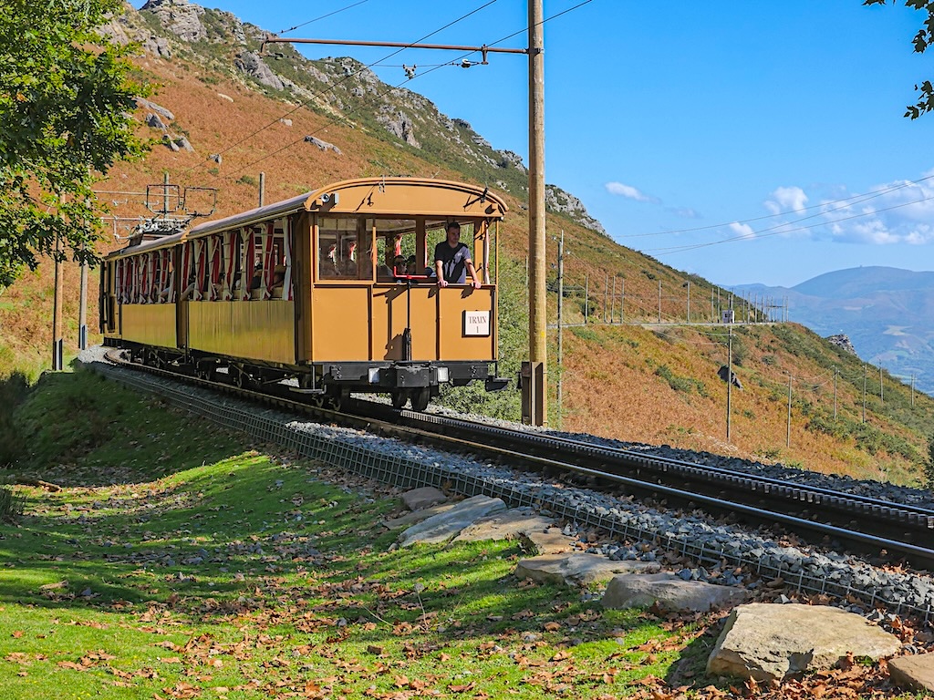 Je croise un peu plus loin la voie à crémaillère du petit train de La Rhune, au débouché d’un carré de hauts résineux à l’ombre desquels paissent un petit groupe de pottoks. À un peu moins de 10 km/h, l’une des voitures de cet iconique élément du Pays Basque est justement en train de monter vers le sommet, emmenant par des pentes atteignant parfois 25% son chargement de touristes réjouis.