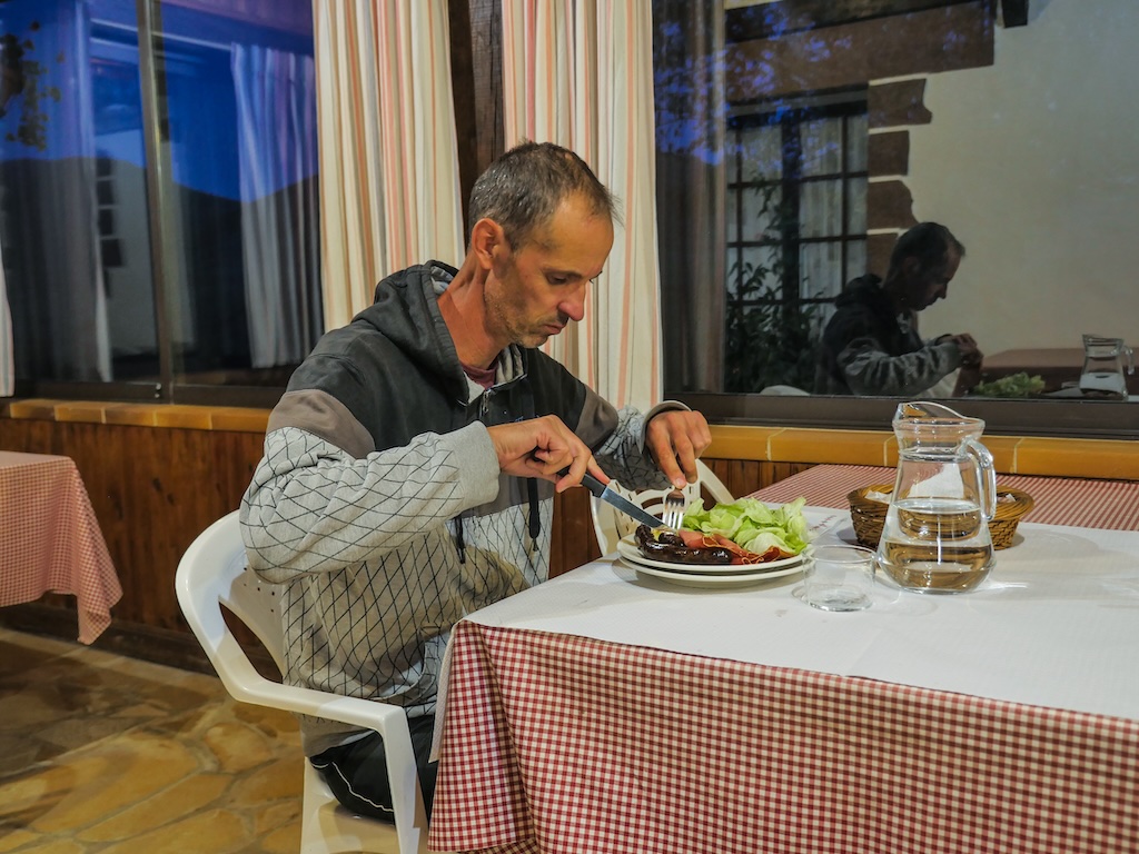 Ici on baragouine l’espagnol, le basque et le français dans un joyeux mélange. On boit un verre en terrasse avec La Rhune d’un côté et la baie de Saint-Jean-de-Luz de l’autre. Quand j’y suis passé, c’était deux mamitas bien sympas qui m’ont accueilli et, plus tard, servi le dîner. Intérieur bois et baies vitrées pour manger face aux Aldudes les repas à base de produits locaux appétissants : pimientos de Padrón, un peu de ventrèche grillée ou omelette aux cèpes : le genre d’endroit qui fait oublier la fatigue d’une journée de marche.