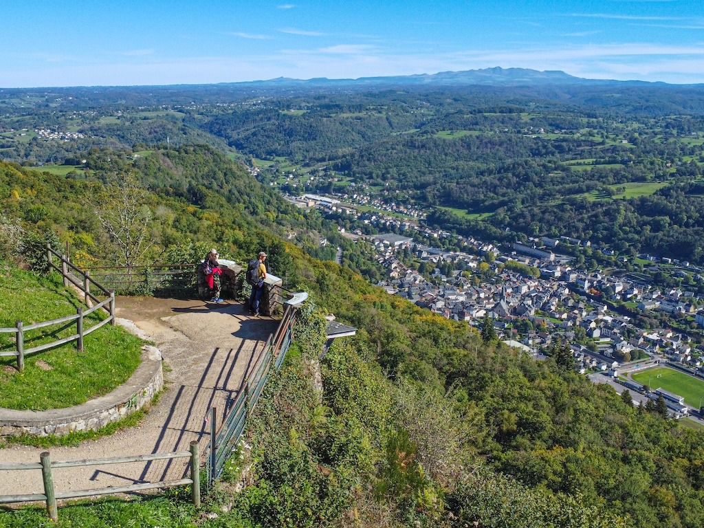 Au-delà de la petite esplanade aménagée sur laquelle je me tiens et de la ville de Bort déployée à mes pieds, la chaîne des Monts Dore est à portée de main. Et, avec elle, le Plateau de l’Artense puis celui du Cézallier – que je sois changé en Salers si ce n’est pas le Signal du Luguet que j’aperçois à l’horizon ! – et, enfin, fermant la vue au sud, le trône en majesté du volcan Cantalien. L’Auvergne servie sur un plateau et présentée au profane grâce à un triptyque de tables d’orientation bienvenu.
