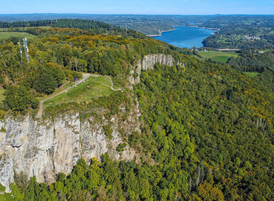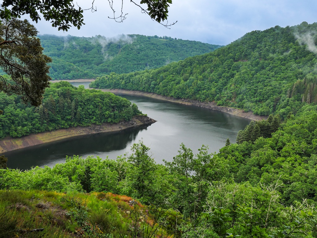 Au débouché d’une pessière parfaitement ordinaire survient une avancée, à peine un rebord, sous laquelle une petite falaise mal rabotée s’écroule. Un puits de lumière ouvre alors grand ses volets sur la plus magnifique vue disponible en catalogue sur la retenue de Bort-les-Orgues. Depuis cette position, on jurerait une petite mer intérieure. Un panorama dingue, sans doute mon préféré depuis le départ, qu’il aurait été criminel de manquer !