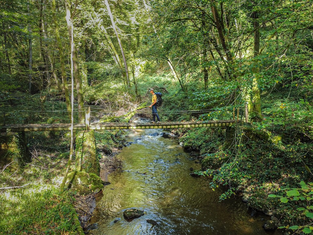 Je franchis plus bas le ruisseau du Lys par une passerelle en bois. À l’image d’autres voies d’eau forestières ici, le Lys, entortillé dans les plis d’une ravine tortueuse, affiche une allure vigoureuse et cascadante. La répétition de ces plongées en forêt, opposant à la foulée du randonneur des pentes aussi soutenues à la montée qu’à la descente, pourra prendre de court qui s’attendait à une promenade de santé en débarquant en Corrèze sur l’Itinérêve.