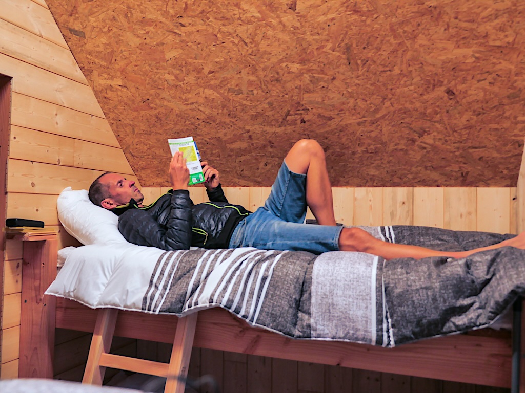 Inutile de prévoir la tente : le site de Saint-Nazaire offre l’occasion de renouer avec les hébergements confortables et fonctionnels que l’association a fait jaillir de terre pour pallier à l’absence de gîte ou d’hôtel et assurer la continuité de l’itinéraire sur plusieurs jours. Je n’en reviens toujours pas de la brillance de l’idée et de la qualité de sa mise en oeuvre. Ici, sur le site de Saint-Nazaire, c’est un « pod » qui permet d’accueillir jusqu’à quatre personnes.