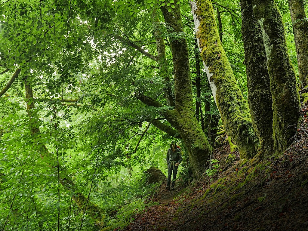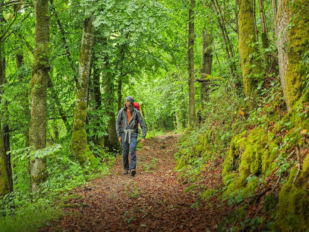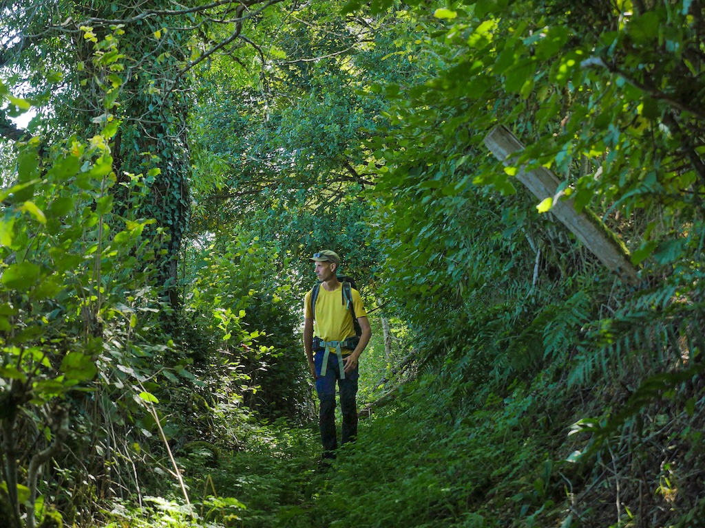 C’est un vrai décor de film d’aventure qui, ce jour-là, dégouline littéralement de pluie. Le printemps, déjà bien avancé, a explosé, faisant parfois disparaître la trace derrière un pêle-mêle végétal alourdi par l’humidité. Je suis douché des pieds à la tête en quelques minutes, promené de long en large et de haut en bas par un sentier en sous-bois parfois raide qui fait monter la température sous la GoreTex.