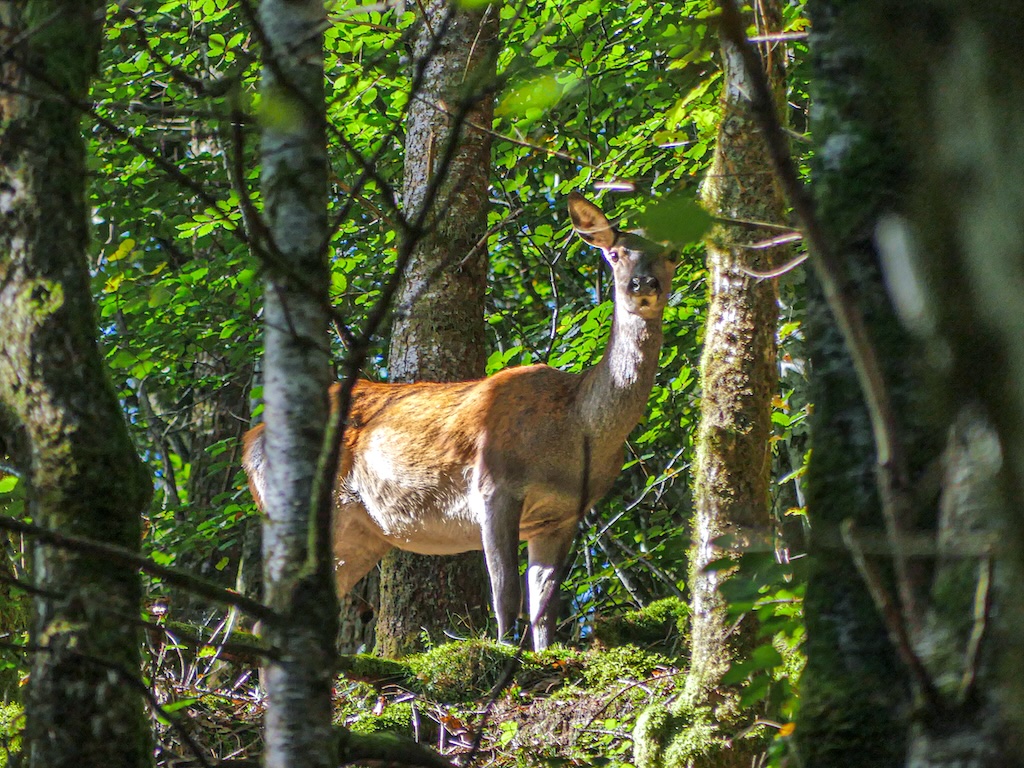 La biche qu’il courtise, en revanche, se tient debout à quelques mètres, dans un rai de lumière me rappelant l’apparition du Dieu Cerf dans Princesse Mononoke. Quelques secondes fugitives, la brièveté d’un instant volé et le tableau s’évanouit dans un tourbillon de feuilles et de branches cassées. Les masses des deux ongulés se fondent dans la touffeur du sous-bois en quelques bonds rapides et puissants. Difficile de faire mieux en guise de bienvenue.