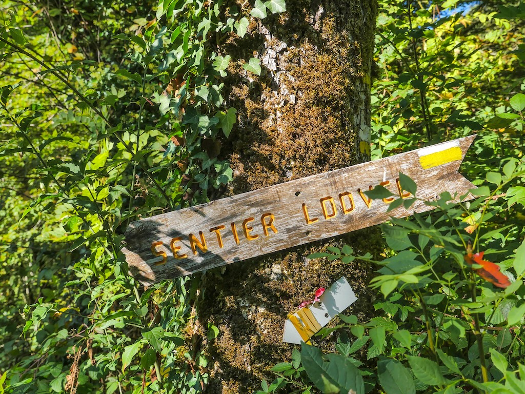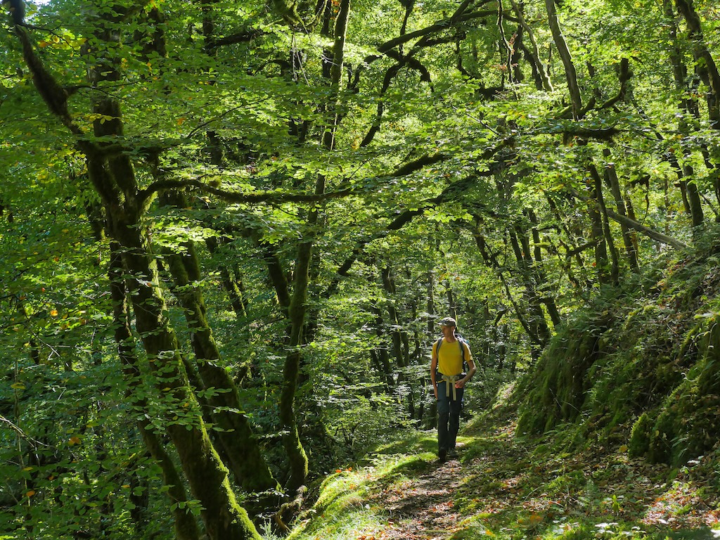 Je quitte l’abri de la chapelle à la faveur d’une relative « accalmie », non sans hésitation. Une pluie moins rageuse a remplacé les hallebardes et je décide de tenter ma chance par la forêt et les versants raides de la rive droite, par lesquels a été dessiné l’itinéraire. N’essayez surtout pas de chercher ces chemins sur l’IGN : ils n’existent pas ! La force de l’Itinérêve c’est, précisément, d’avoir ressuscité, sinon carrément ouvert, des sentes et passages tombés dans l’oubli pour éviter de fastidieux segments goudronnés.