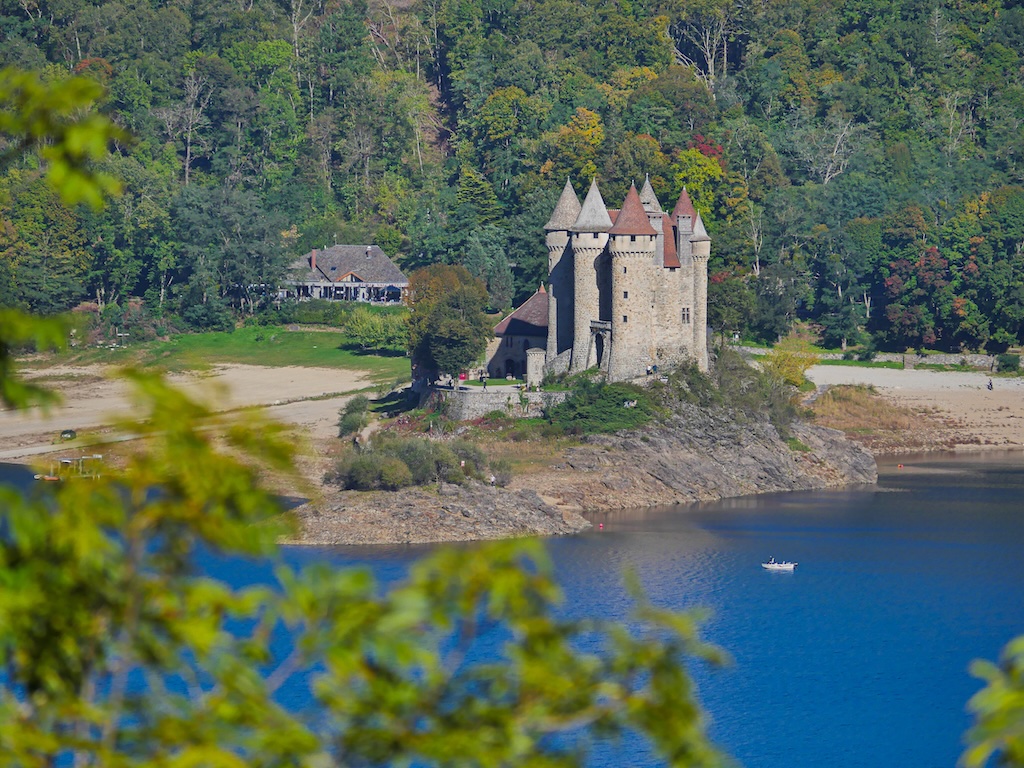 Jouée en boucle autour du chemin, la musique de la forêt pénètre le marcheur au point de lui faire perdre les notions de distance et de temps. La journée est déjà bien avancée lorsque, à la faveur d’une trouée, j’aperçois les six tours et les façades percées par des fenêtres à meneaux du Château de Val, sur la rive opposée de la Dordogne. Bien que situé dans le Cantal – plus exactement sur la commune de Lanobre – l’édifice appartient à la commune corrézienne de Bort-les-Orgues.