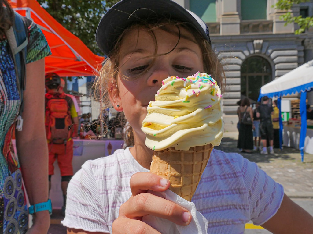 Coire est une ville au sein de laquelle il fait bon se perdre. On y déjeune sur le pouce sur l’une de ces grandes tablées dressée à même la rue à l’occasion des festivités. Côté déplacement, on opte pour le bus, très pratique depuis le camping, mais le réseau cyclistes et les infrastructures qui vont avec nous impressionnent véritablement.