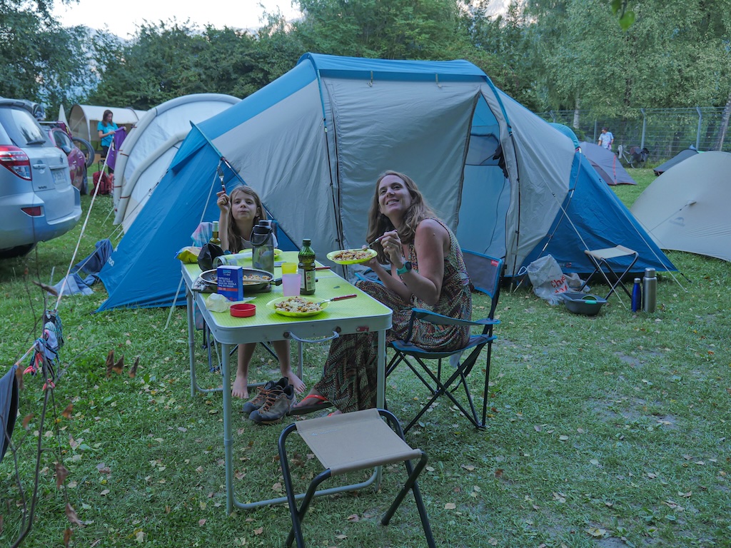 Comme mentionné un peu plus haut, nous avons posé notre camp de base sur l’aire réservée aux tentes du camping TCS de Flims. C’est le dernier camping, situé à la sortie de Flims sur la route menant ensuite à Laax. En temps normal les campeurs comme nous – ceux avec des tentes petites à moyennes – sont invités à s’installer tout en bas du camping, sur les abords du centre sportif situé au terminus de la petite route goudronnée.