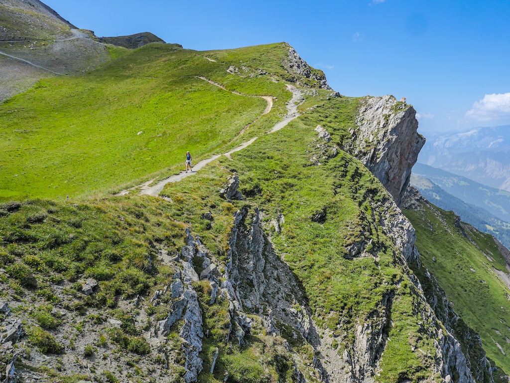 Après une première partie étonnante, dans les ravins de la face nord-ouest, on retrouve assez rapidement le confort des alpages tandis que l’itinéraire flirte avec la proximité de hauts remparts rocheux. Le sentier croise – voire emprunte parfois – le même parcours que les VTT, sinuant dans des immensités vertes où paissent les vaches grises rhétiques.