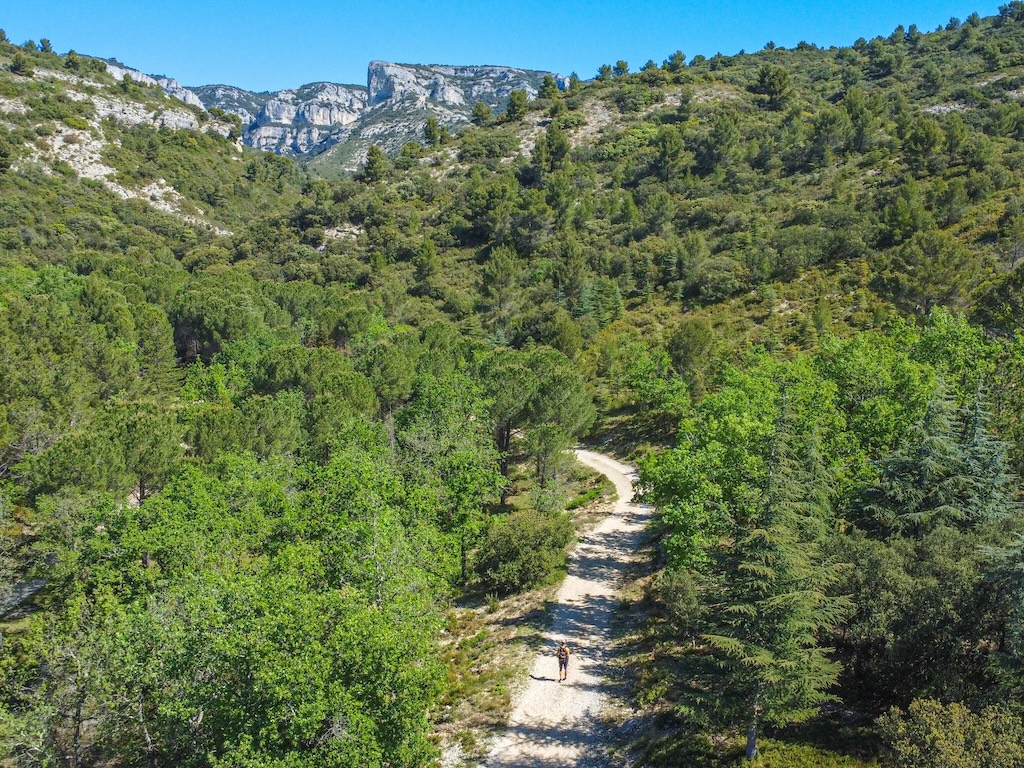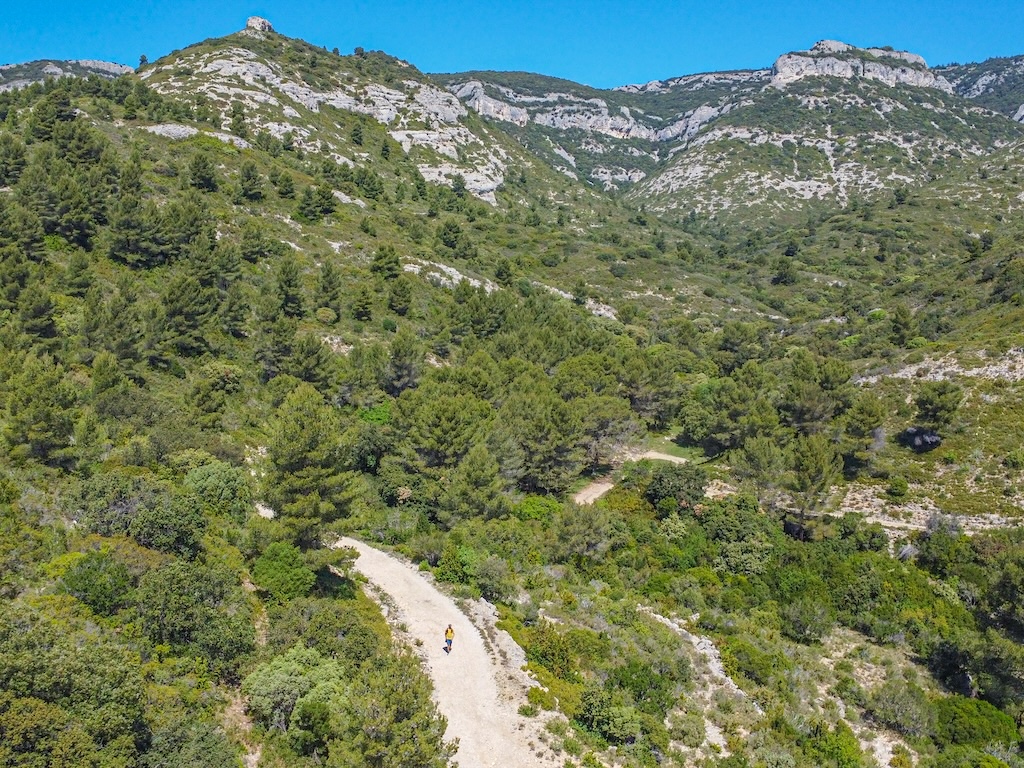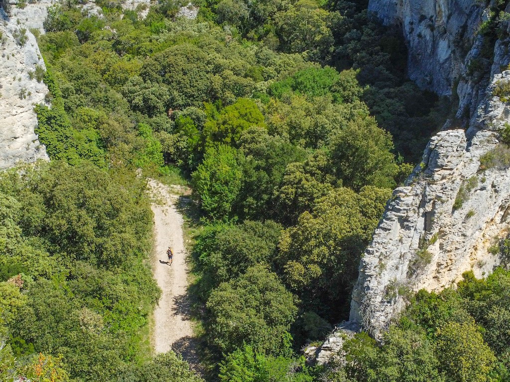 À l’ombre des Pins Bruttia, des Cyprès et des Pins Parasol, l’air se charge soudainement de l’odeur de l’humus et de la résine. Une parenthèse dans le poumon vert de l’itinéraire avant de bientôt plonger dans les entrailles de la montagne, une fois la grande Crau de Saint-Phalez contournée par un agréable single ombragé se faufilant à travers la pinède.