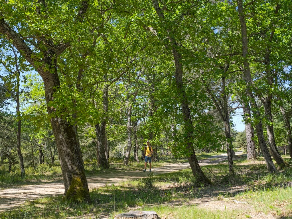 Je retrouve ensuite les balises blanc et rouge du GR®6 qui m’entrainent dans les pas des Vaudois vers le sommet du Vallon Bernard depuis lequel je jette un dernier regard sur la vallée de la Durance. Ensuite les chênes, les pins et quelques cèdres échappés de la forêt éponyme referment leurs feuillages sur le sentier ouvert à travers Peyre Plate et en direction de Sadaillan.