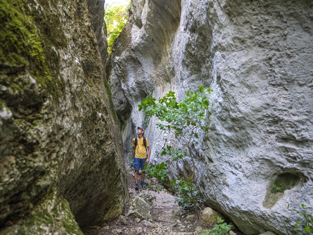 On y progresse dans un clair-obscur permanent, entre des blocs de pierre polis par les crues millénaires. C’est un lieu de murmures qui existe, presque anonyme, dans l’ombre de Regalon et je le découvre parcouru par le frisson enthousiaste de l’exploration. Survient un carrefour, dissimulé dans la touffeur du sous-bois.